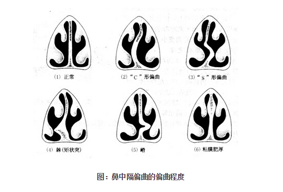 鼻中隔偏曲(又称嵴突):鼻中隔偏曲是指鼻中隔偏离中线且引起临床症状的一种鼻内畸型临床常表现为持续或间歇性的鼻塞、流脓鼻涕、头晕、头痛、流鼻血等。事实上大多数人的鼻中隔都有程度不同的偏曲,如果偏曲程度轻微,未引起以上临床症状,一般不需要治疗。只有当鼻中隔向一侧或两侧偏曲或局部有突起并引起鼻腔功能障碍或产生症状时,方诊断为鼻中隔偏曲。偏曲一般呈C形或S形,如呈尖锥样突起,则称骨棘或矩状突;如呈由前向后的条形山嵴样突起,则称骨嵴。