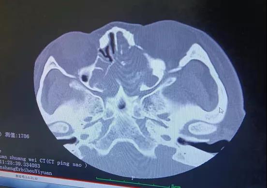 接诊后,张思叶主任第一时间给患者做了详细地检查,发现患者左侧中鼻道有一半透明荔枝样新生物堵塞鼻孔,同时双侧下鼻道大量脓性分泌物,CT显示:鼻窦内部可见到颗粒状或斑点状高密度影,内有钙化灶,鼻窦内侧壁受压向中线移位,鼻中隔骨质连续性中断、变形,提示鼻腔及鼻窦占位性病变。