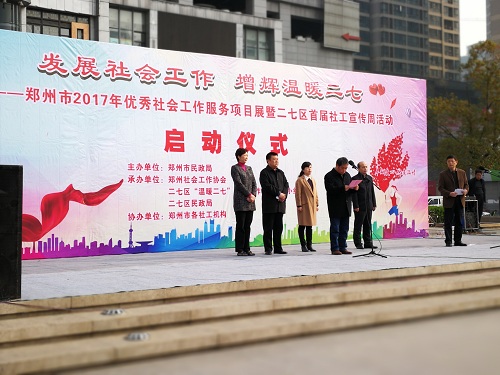 3月21日上午,由郑州市民政局主办,郑州社工协会、二七区民政局等单位承办的“郑州市2017年优秀社会工作服务项目展暨二七区首届社工宣传周活动”在升龙广场举行。