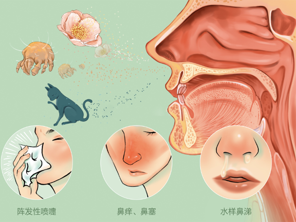 过敏性鼻炎患者以打喷嚏、流清水样鼻涕、鼻痒、鼻塞等局部症状为主,可伴咽痒、咳嗽,常有既往发病史,一般无咽痛,无体温升高,全身症状不明显。