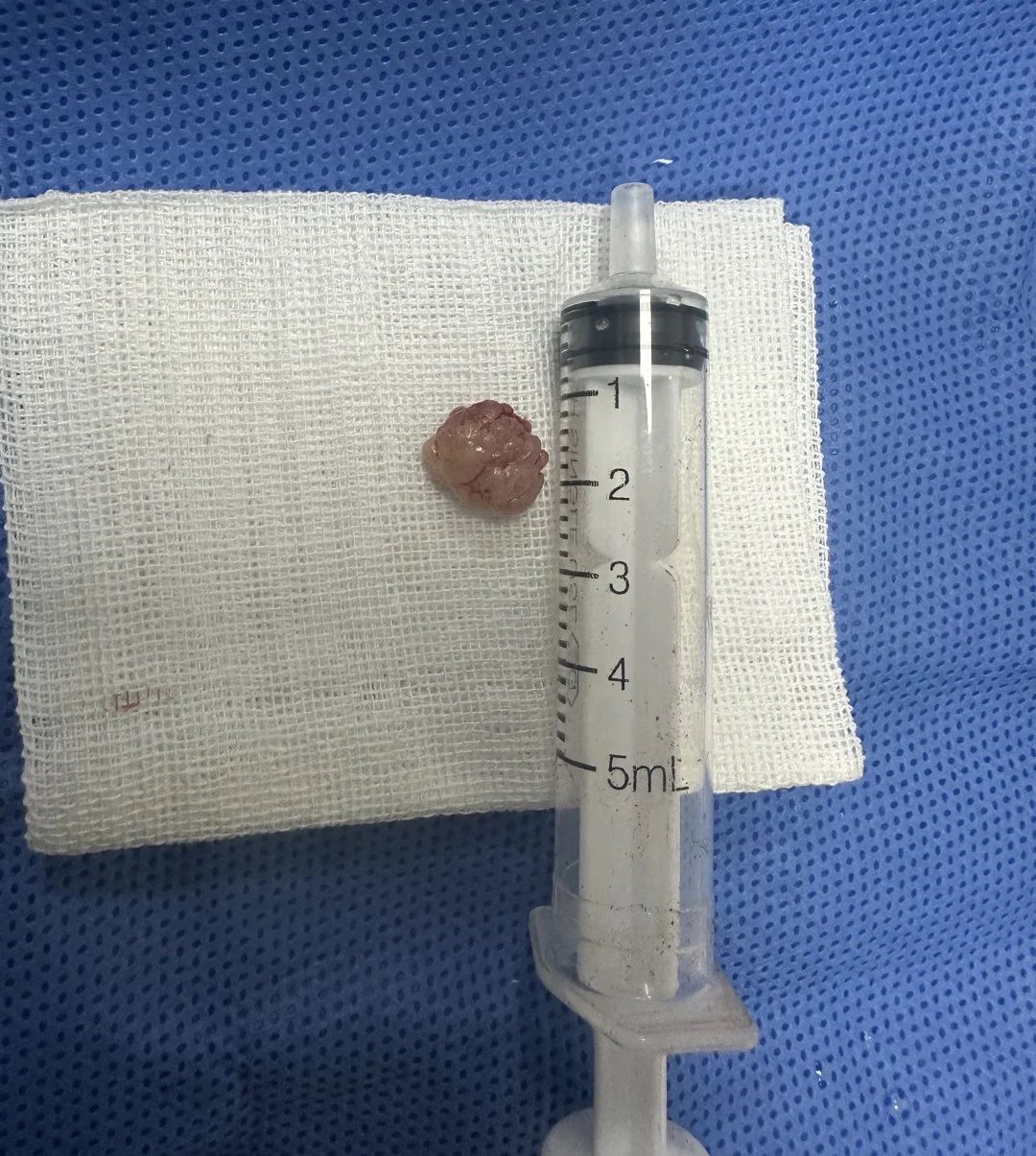 手术使用的喉钳钳头很小,而息肉很大,在局麻的情况下进行清理难度非常大。两位主任克服重重困难,密切配合,一点一点地取出了息肉组织。