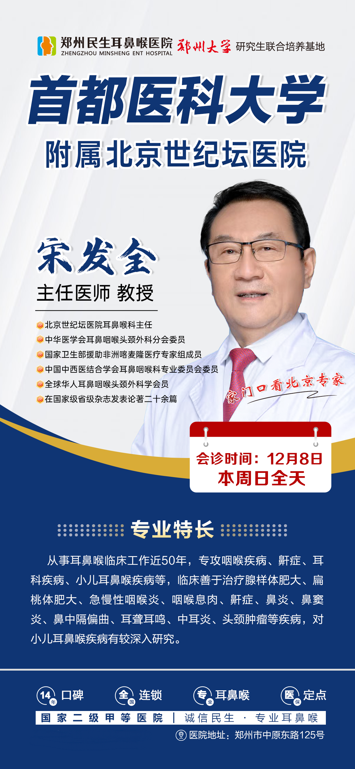 为了满足广大群众日益增长的就医需求,为就诊患者提供高效、便捷、面对面的北京专家医疗服务,郑州民生耳鼻喉医院于12月8日(周日)特邀首都医科大学附属北京世纪坛医院宋发全教授来院会诊,让您“足不出市”就能享受到北京知名专家的优质服务。