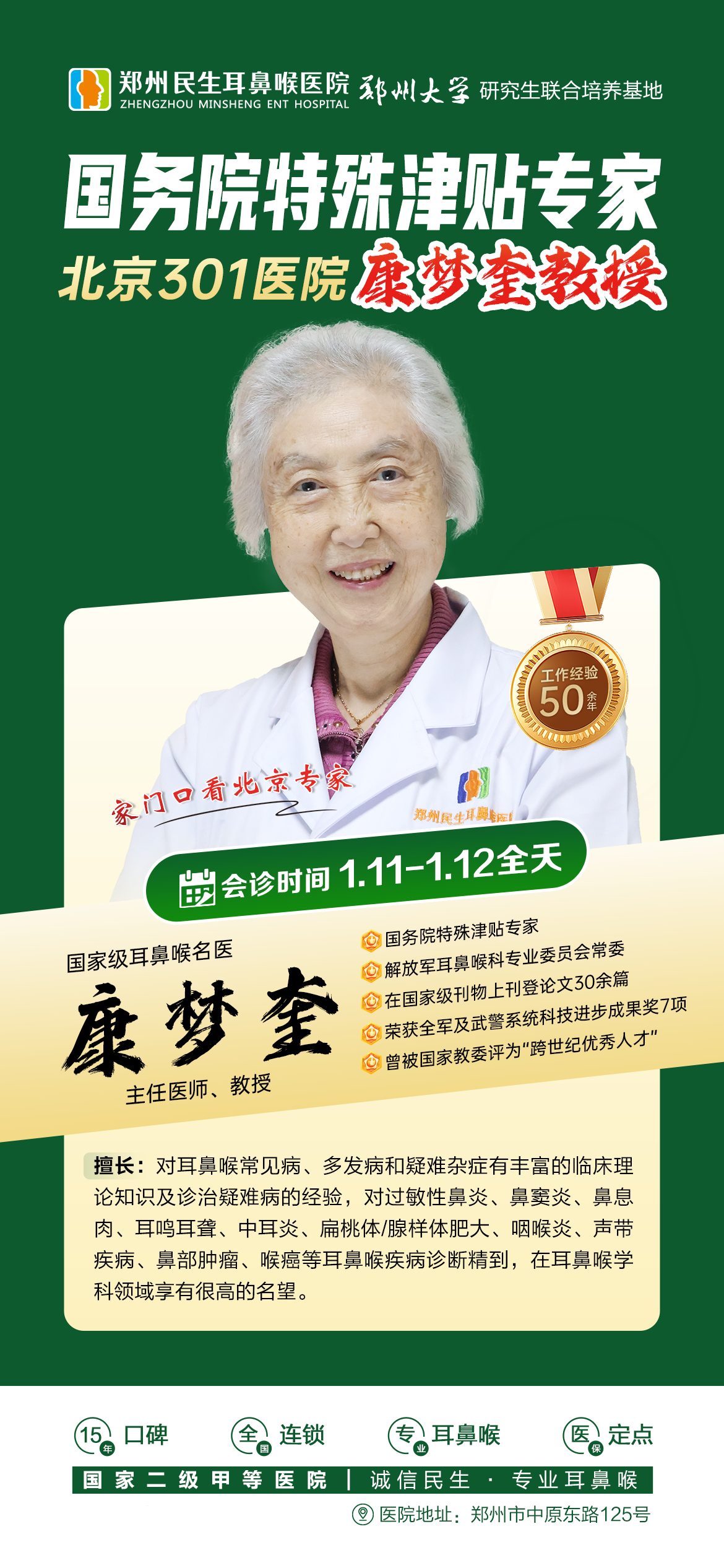 为积极响应国家促进优质医疗资源下沉的号召,郑州民生耳鼻喉医院特邀原北京301医院耳鼻喉科主任、国务院特殊津贴专家康梦奎教授亲临我院,于1月11日、12日(周六、周日)举办为期两天的专家会诊活动。让郑州及周边地区居民在家门口就能享受国家级医疗服务,看病更省心、更放心!