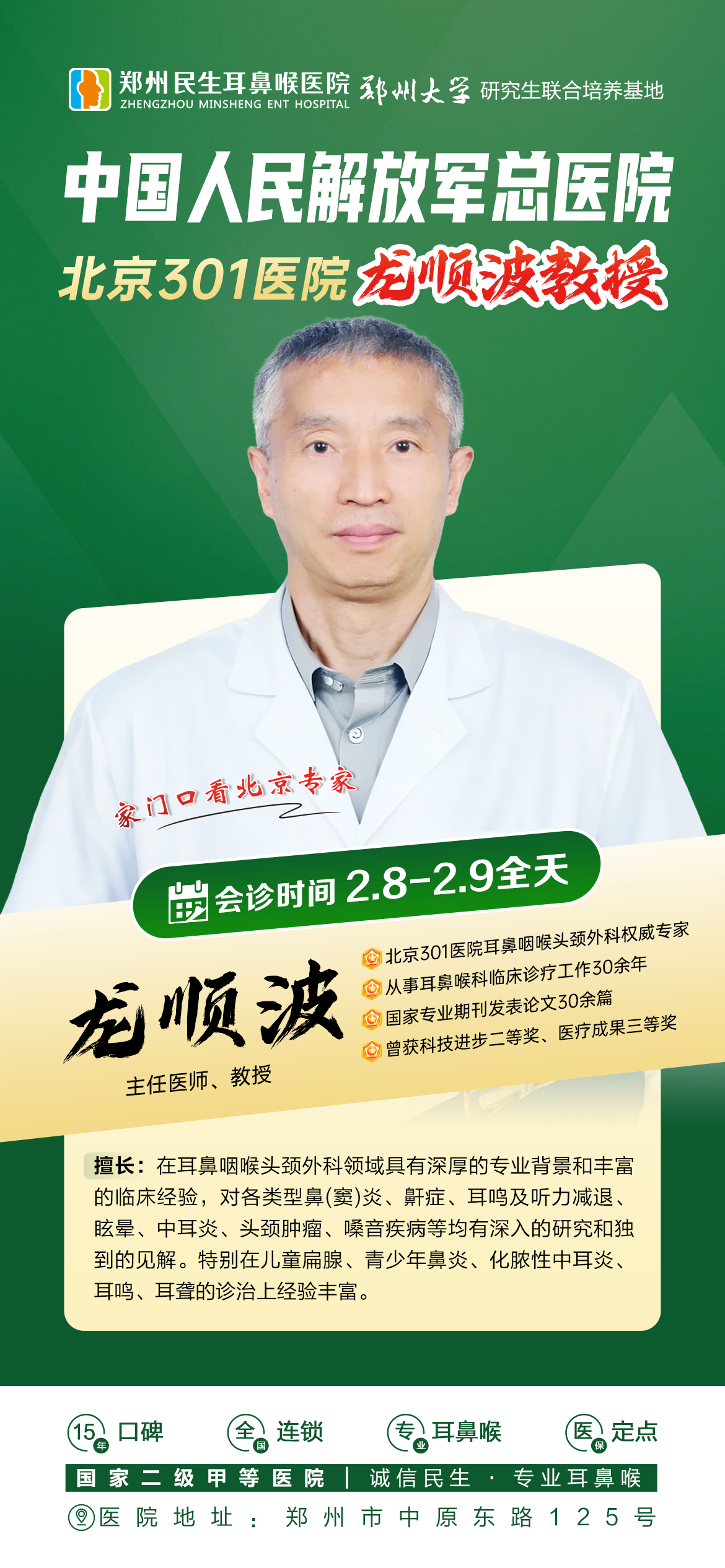 春节刚过,为满足广大患者对优质医疗资源的迫切需求,郑州民生耳鼻喉医院特邀北京301医院耳鼻喉科主任医师龙顺波教授,于2月8日、9日(周六、周日)亲临我院,开展专家会诊及查房活动,让郑州及周边居民在家门口即可便捷享受北京专家的权威诊疗服务!