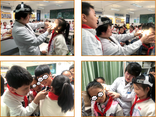 针对临床工作中常见却易被忽视的“儿童打呼噜”问题,蒋主任向老师和学生们进行了重点科普。“在日常生活中,不少家长看到孩子睡觉打呼就认为孩子睡得香,这种观点是错误的,实际上孩子打呼是一种病态,要及时带孩子到医院耳鼻喉科就诊,及时治疗,以免影响孩子的生长发育。一般来说儿童打呼最主要的原因就是上气道阻塞,其中最常见的病因是腺样体、扁桃体肥大。”蒋主任介绍,由于长期张口呼吸,致使面骨发育发生障碍,颌骨变长,腭骨高拱,牙列不齐,上切牙突出,唇厚,缺乏表情,出现所谓腺样体面容。讲座结束后,蒋主任用电耳镜为孩子们做耳朵检查,对需要进一步就医的孩子提出建议。