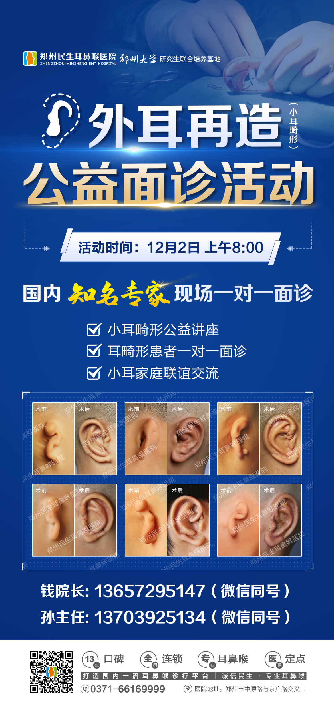 【预约】应广大小耳畸形患者就诊需求,12月2日,我院特邀北京知名外耳再造专家团队再次莅临郑州民生耳鼻喉医院,为患者提供公益讲座及一对一面诊,根据患者的个人条件制定最适合的个性化手术方案,以达到最佳的近期和远期效果,请患者及家属提前进行预约!