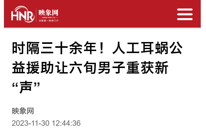 近日,大象新闻、映象网等官方媒体对我院第二位接受人工耳蜗公益救助,重返有声世界的患者事迹进行了采访报道,引起了社会的广泛关注。