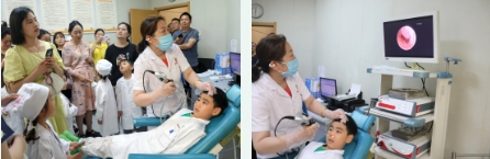 2、在内窥镜体验区,小朋友们瞪大了眼睛,通过高科技内窥镜设备,亲眼目睹了耳鼻喉的内部结构,不时发出阵阵惊叹:“哇,原来我的耳朵里面长这样!”。