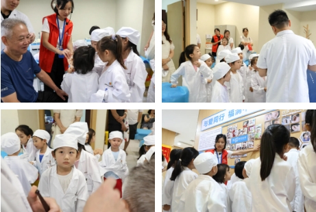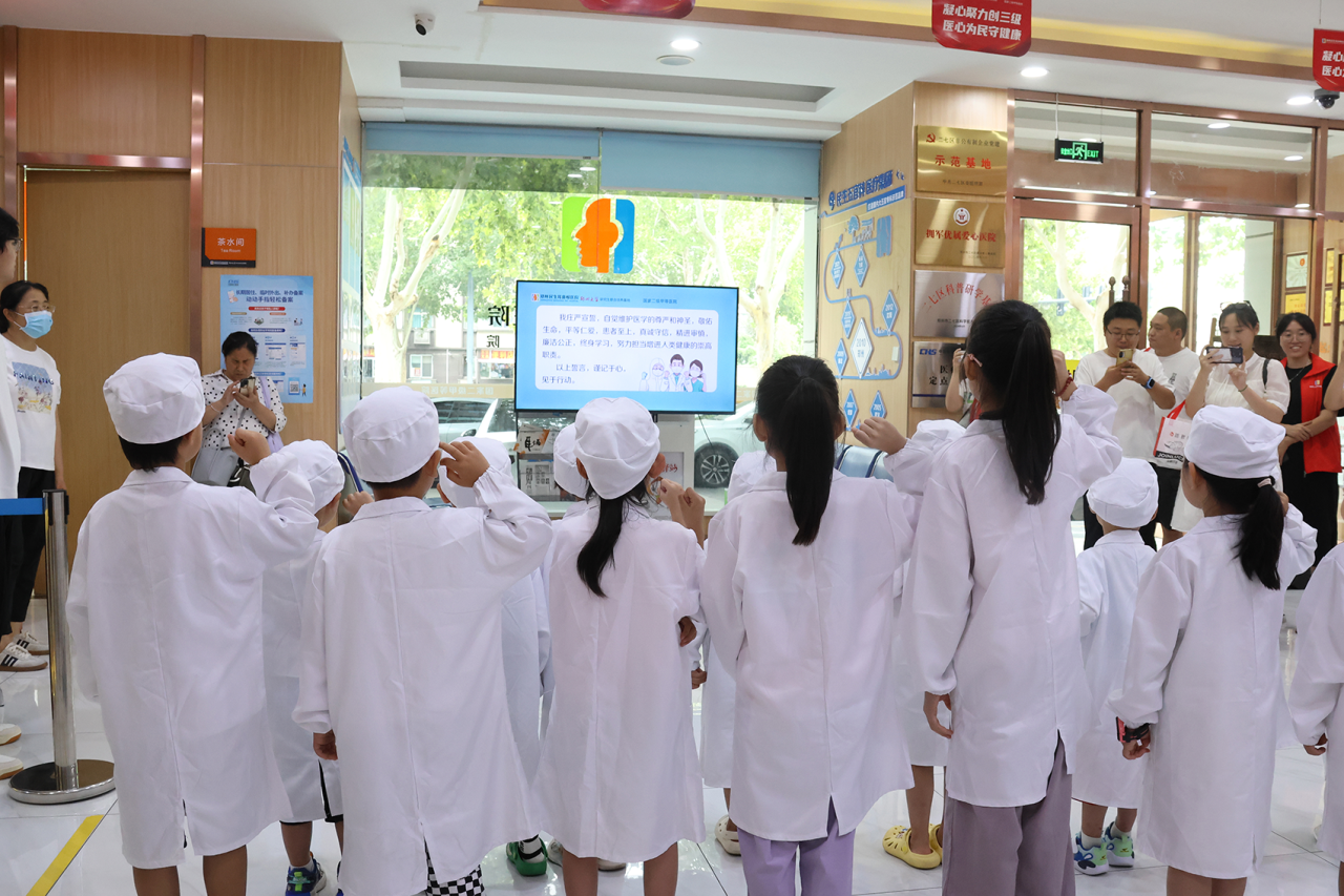 踏入医学体验前,小朋友们紧握右拳、高举右手,跟随工作人员高声宣读医师誓言,感受医者的神圣与责任。