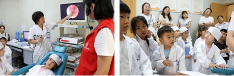 在内窥镜体验区,孩子们瞪大了眼睛,惊叹于自己耳鼻喉的内部结构。他们看着屏幕上清晰的图像,发出阵阵惊呼。