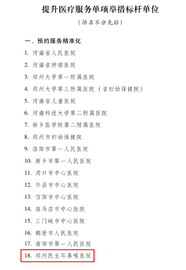 作为河南省内耳鼻喉疾病防治领域12年的老牌专科医院,郑州民生耳鼻喉医院获得获得“提升医疗服务单项举措标杆单位”荣誉称号,也是唯一一家社会办医上榜“预约服务精准化”表彰的单位。