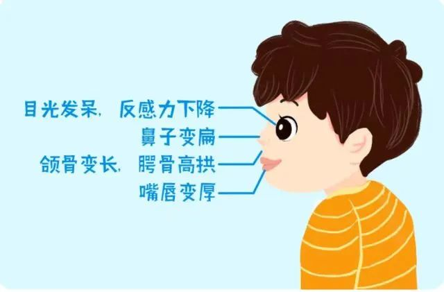 长期张口呼吸也会导致颌面骨发育障碍,出现颌骨变长、腭骨高拱、牙列不齐、上切牙突出、唇厚、上唇上翘、面容呆滞等,也就是很多家长非常关注的“腺样体面容”。