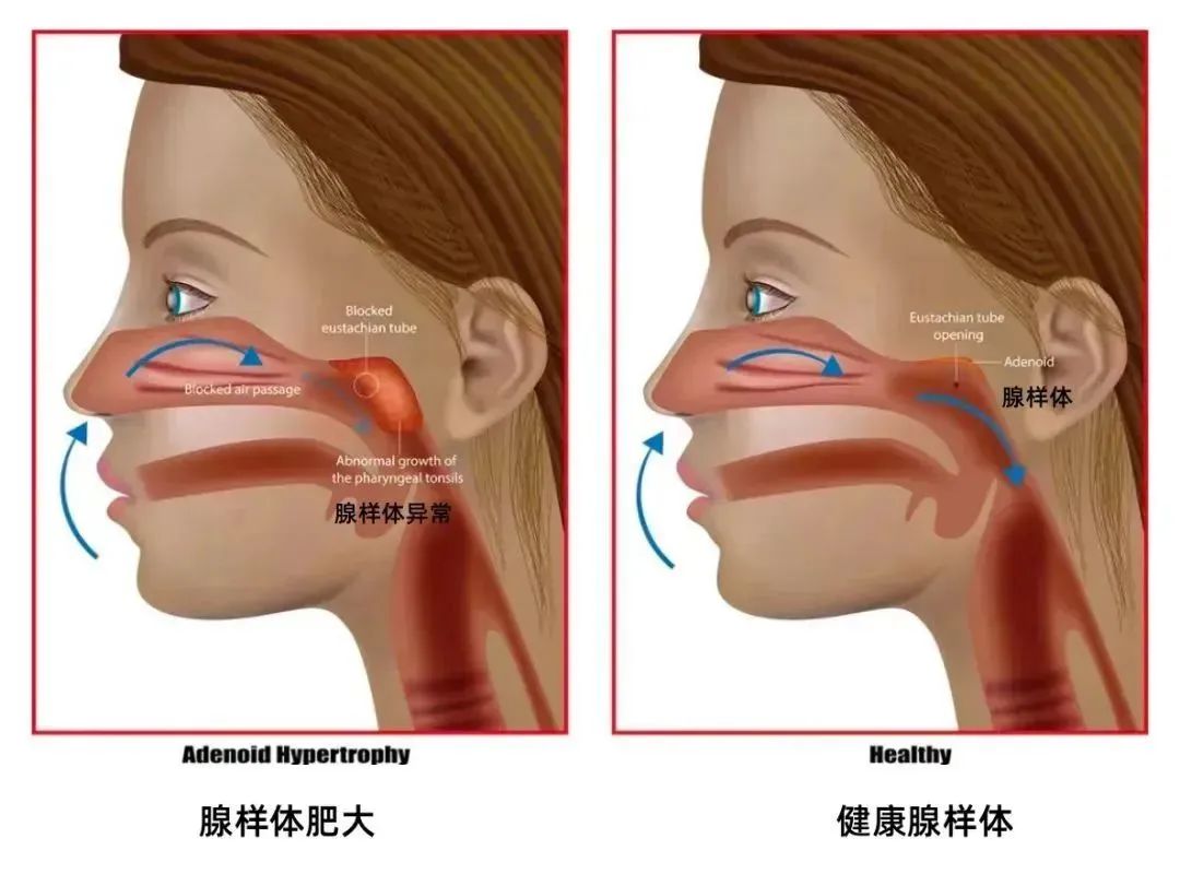 • 病理性肥大:当孩子发生炎症(如感冒)时,腺样体会出现病理性增生,药物治疗消除炎症后,肥大的腺样体会消退。但如果孩子反复感染、肥大的腺样体消不下去时,便会影响孩子的身体健康,引发鼻塞、打鼾、张口呼吸,甚至缺氧,严重时还会诱发一系列并发症,需要及时治疗。