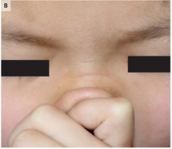 与成人不同的是,儿童患者严重时可能会出现特殊面容的改变,比如变应性黑眼圈、变应性皱褶、腺样体面容。