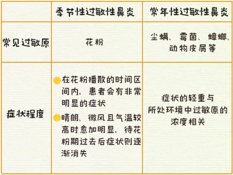 鼻炎:鼻黏膜发炎肿胀、鼻痒、鼻塞、喷嚏不断,流清水样的鼻涕,通常上午的症状会比晚上严重,也会在干燥刮风的天气里加重,室内比室外感觉稍好。