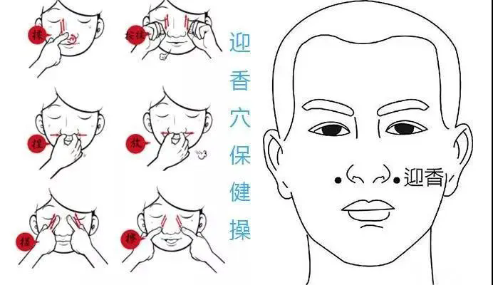 ③穴位按摩法:用双手食指指腹分别按揉双侧上迎香及迎香1~2分钟。