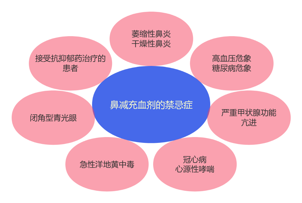 鼻用减充血剂长期反复使用后最常见的副作用是药物性鼻炎,主要表现为鼻腔干燥、烧灼和针刺感。此外,鼻用减充血剂喷鼻或滴鼻后可向后流至咽部,儿童咽入胃内也可发生中毒反应。特别提醒:尽量吐出、不要咽下!过量使用容易引起全身副作用,包括嗜睡、升高血压、心率失常、升高血糖、引起甲亢和青光眼等。