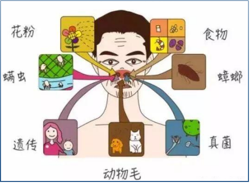 吸入类:花粉、粉尘螨、动物毛屑、真菌等。