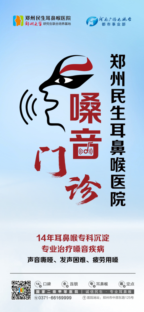 郑州民生耳鼻喉医院嗓音门诊集预防、诊断、治疗于一体,拥有一支经验丰富的医疗团队和先进的诊疗设备。医院引进的声带局部治疗技术,结合中西医治疗理念,针对发声困难、嗓音嘶哑、声带炎、声带息肉等常见问题无需手术,无副作用,疗程短且效果显著。已帮助众多患者快速恢复嗓音,重获交流自信。