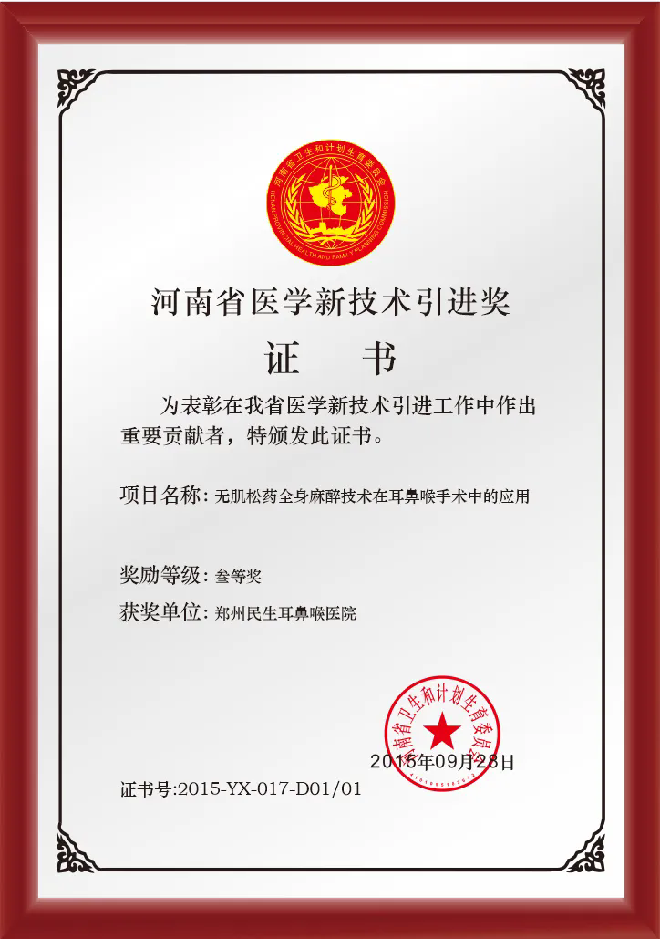 郑州民生耳鼻喉医院作为市残疾儿童康复救助定点医疗机构,麻醉技术成熟且值得信赖。医院麻醉科由资深专家团队领衔,尤其擅长低龄儿童麻醉。医院率先引进了“无肌松麻醉技术”,并于2015年荣获了“河南省医学新技术引进奖”,广泛应用于小儿腺样体手术、人工耳蜗植入术、外耳再造术等各类耳鼻喉手术,不仅提升患者围麻醉期的舒适度,还大大降低麻醉风险,助力疾病康复,同时减轻家庭经济负担。