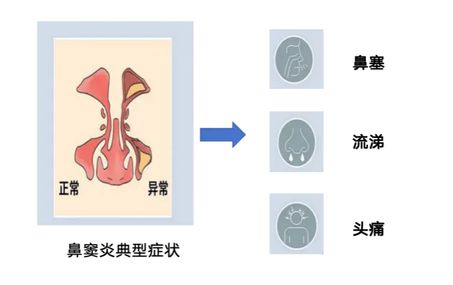 表现为持续性鼻塞,由鼻腔黏膜肿胀和分泌物积聚于鼻腔所致。擤除分泌物后,鼻通气可暂时得到改善,很快又出现鼻塞。