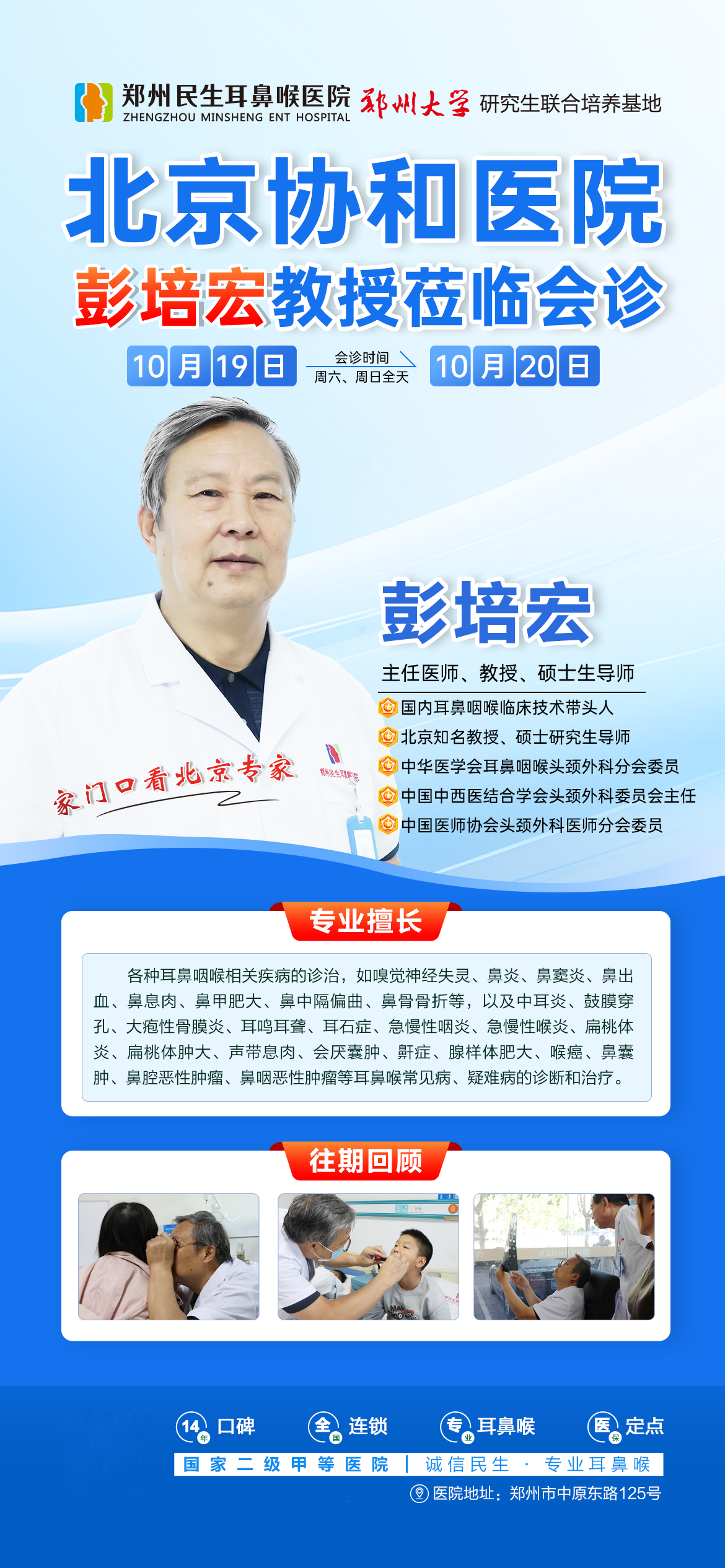 10月19日、20日(周六、周日),北京协和医院彭培宏教授亲临我院开展会诊活动。无论是耳鼻喉常见病症,还是疑难杂症,患者都能获得北京专家一对一的亲诊服务。机会难得,想找北京专家看诊的朋友,请尽快拨打400-837-1120预约挂号,切莫错过!