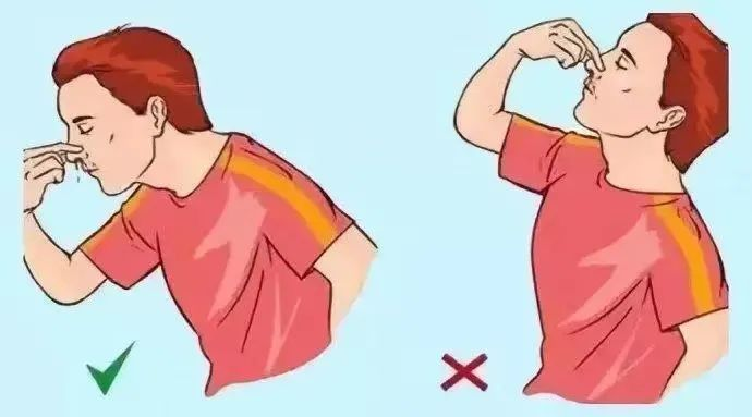 鼻出血时,身体前倾,不要仰头止血,用手指压紧出血一侧或两侧的鼻翼,保持5-10分钟,有条件可用冰毛巾敷前额。若鼻腔反复出血,血流量较大,应及时就医。