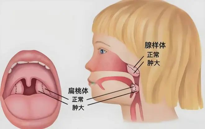 腺样体和扁桃体肥大,导致上气道阻塞。
