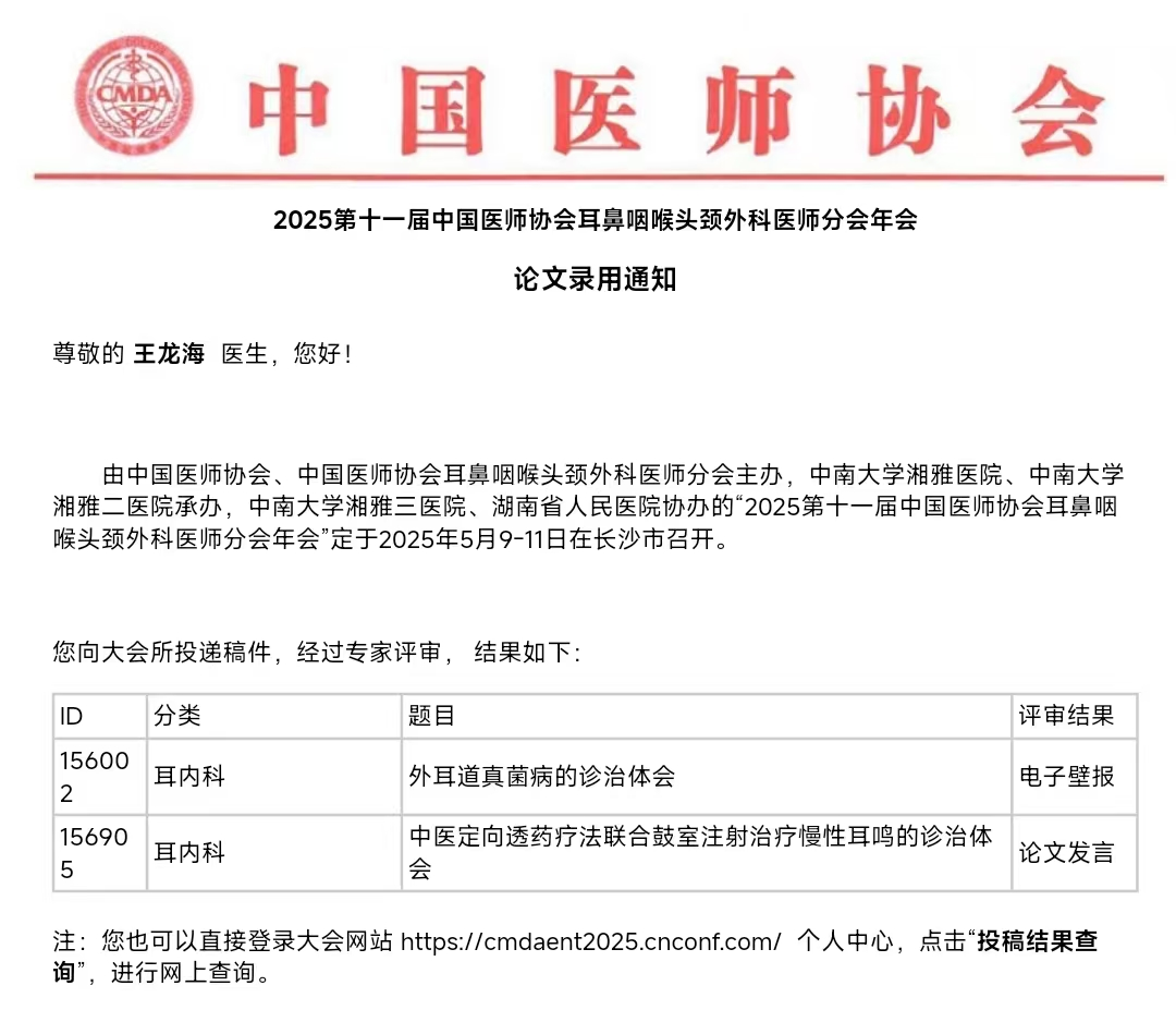 《中医定向透药疗法联合鼓室注射治疗慢性耳鸣的诊治体会》:被评为论文发言,将在大会上进行交流展示。该论文系统总结了我院在