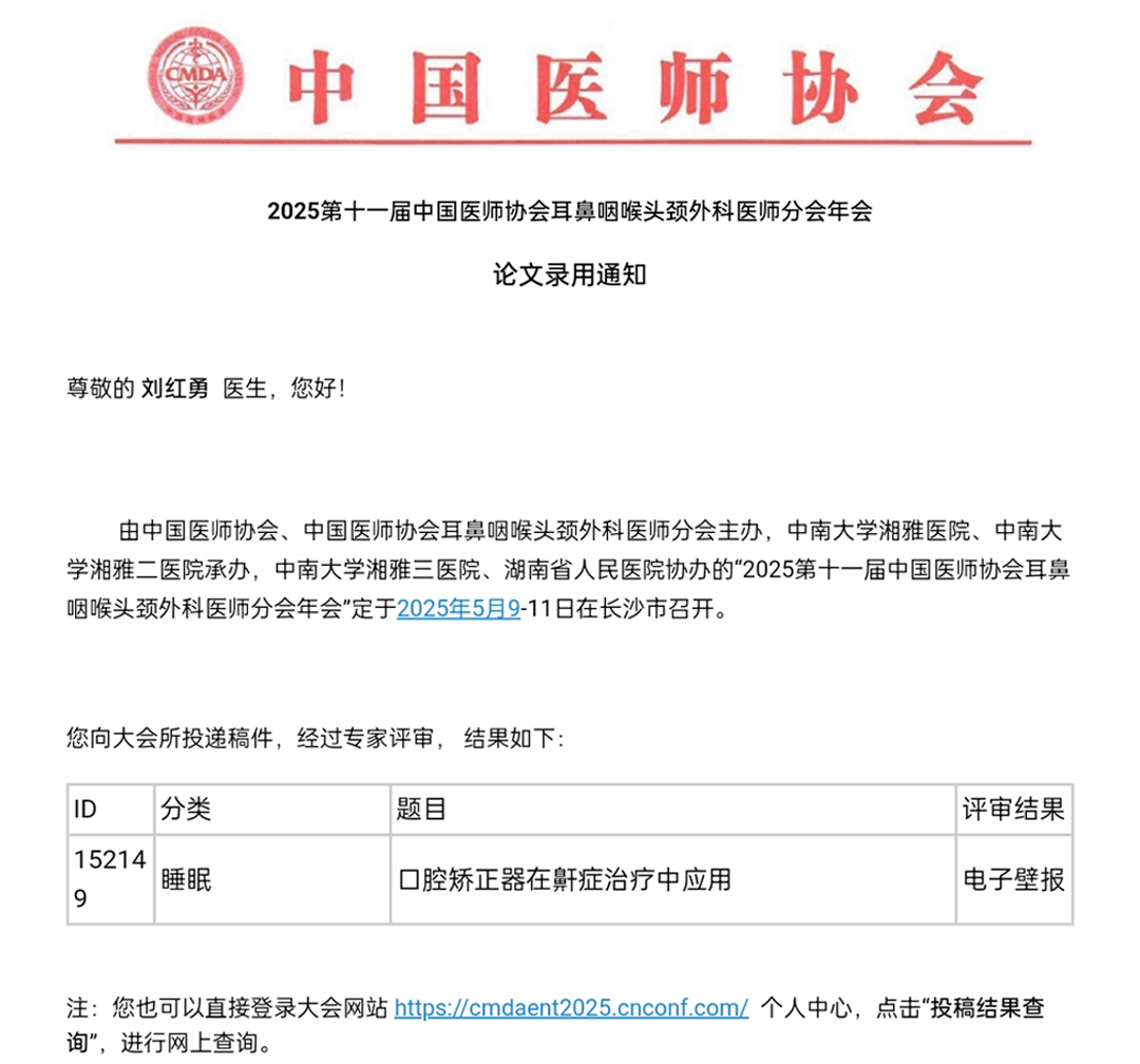 《口腔矫正器在鼾症治疗中应用》也顺利通过评审,入选本次大会