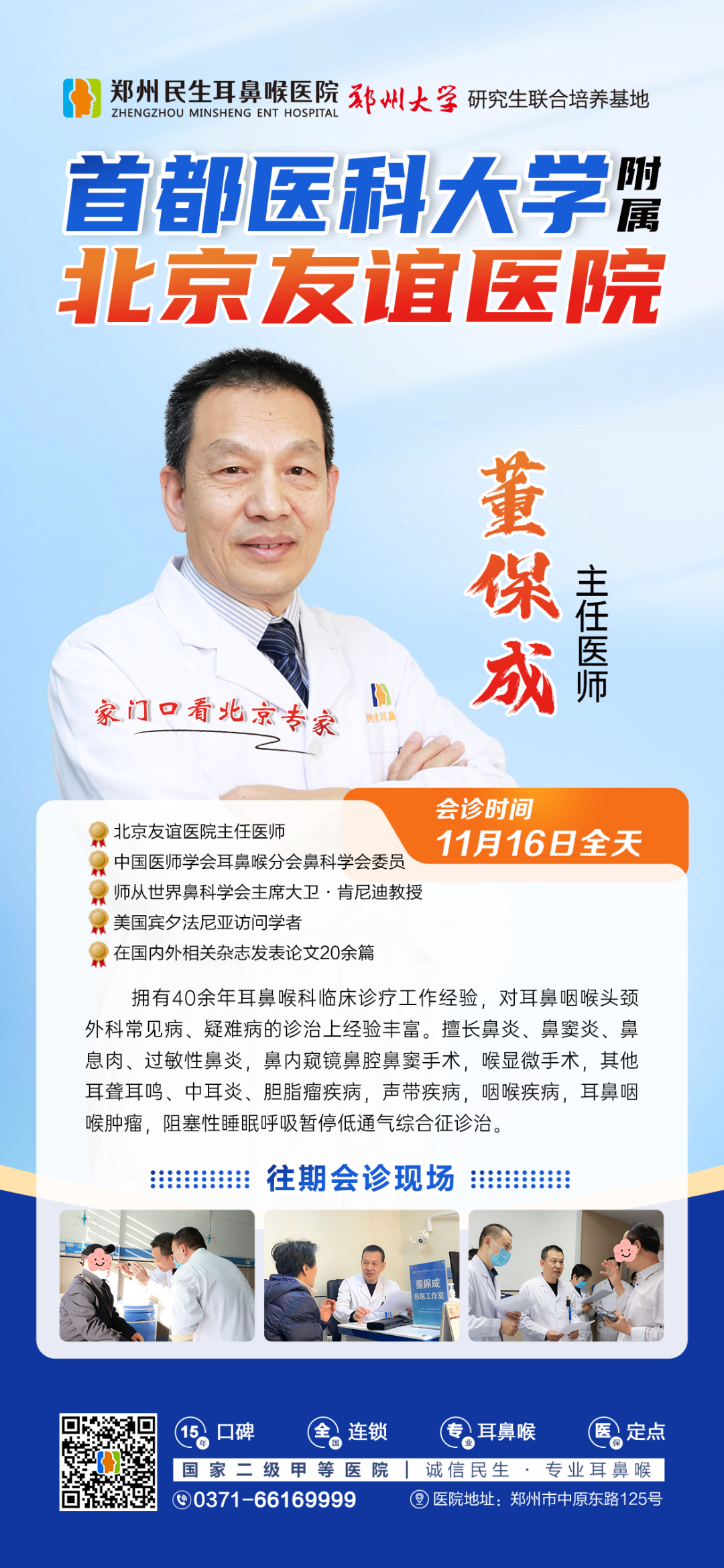 为帮助更多患者在家门口享受优质医疗服务,11月16日(周日全天),首都医科大学附属北京友谊医院耳鼻咽喉头颈外科董保成主任将亲临郑州民生耳鼻喉医院,开展1天限号会诊查房。