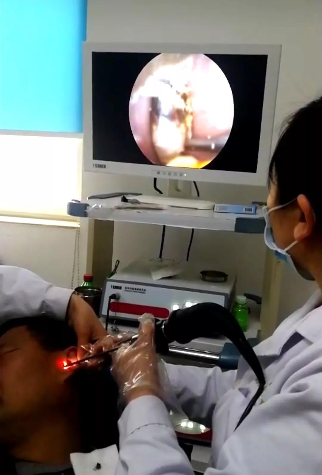耳内窥镜下将外耳道在显示屏上放大百倍,医生和患者家属可清晰看到耳道内是否有耳屎(耵聍)、外耳道炎,鼓膜是否完好无损,对较大的耳屎在可视下由专业医生完成取出。