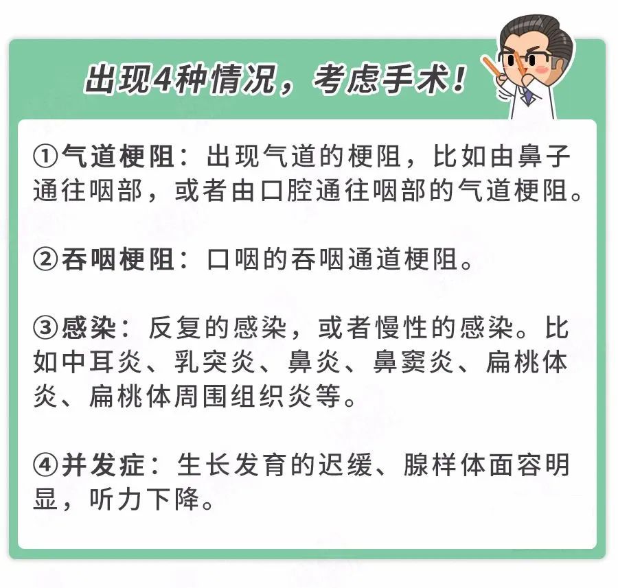 腺样体肥大是3-8岁儿童中的一个常见病,不及时治疗的话,不仅会形成腺样体面容,损害孩子的颜值,还会引发中耳炎、鼻窦炎、咽炎、打呼噜、憋气、睡觉不安稳等疾病和症状,影响孩子的身高和智力发育。