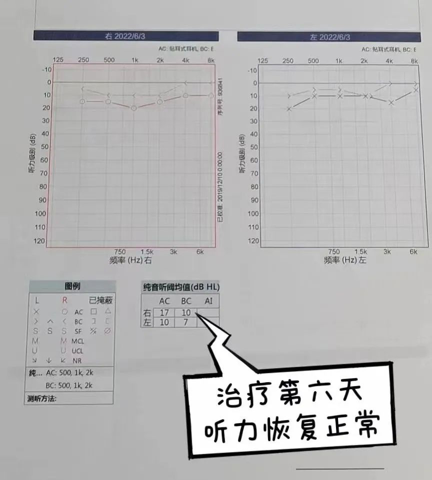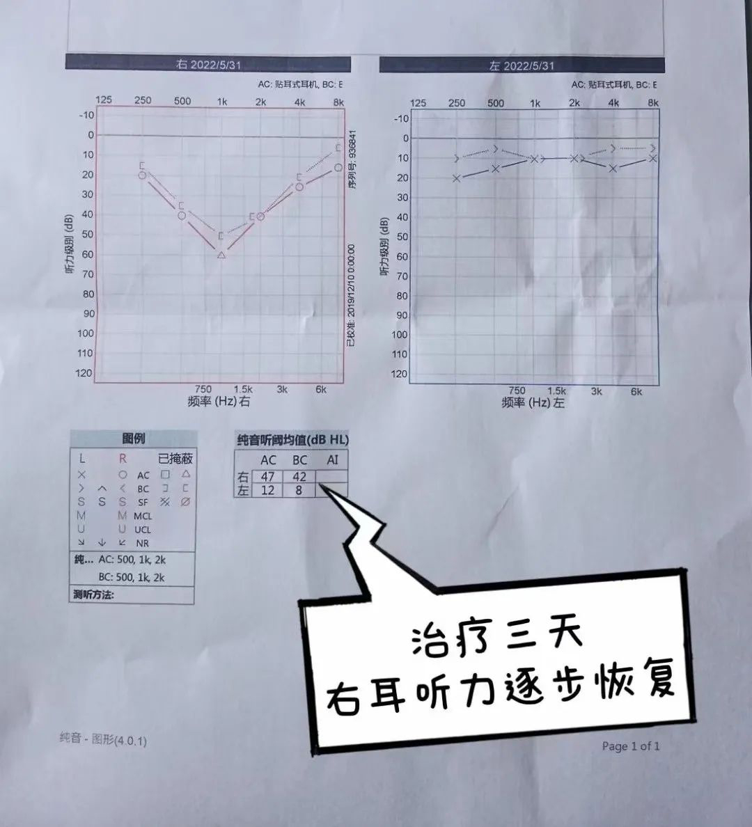 在经过“耳四联叠加疗法”三天的治疗后,此患者右耳的听力逐步得到恢复,六天后,听力恢复正常。