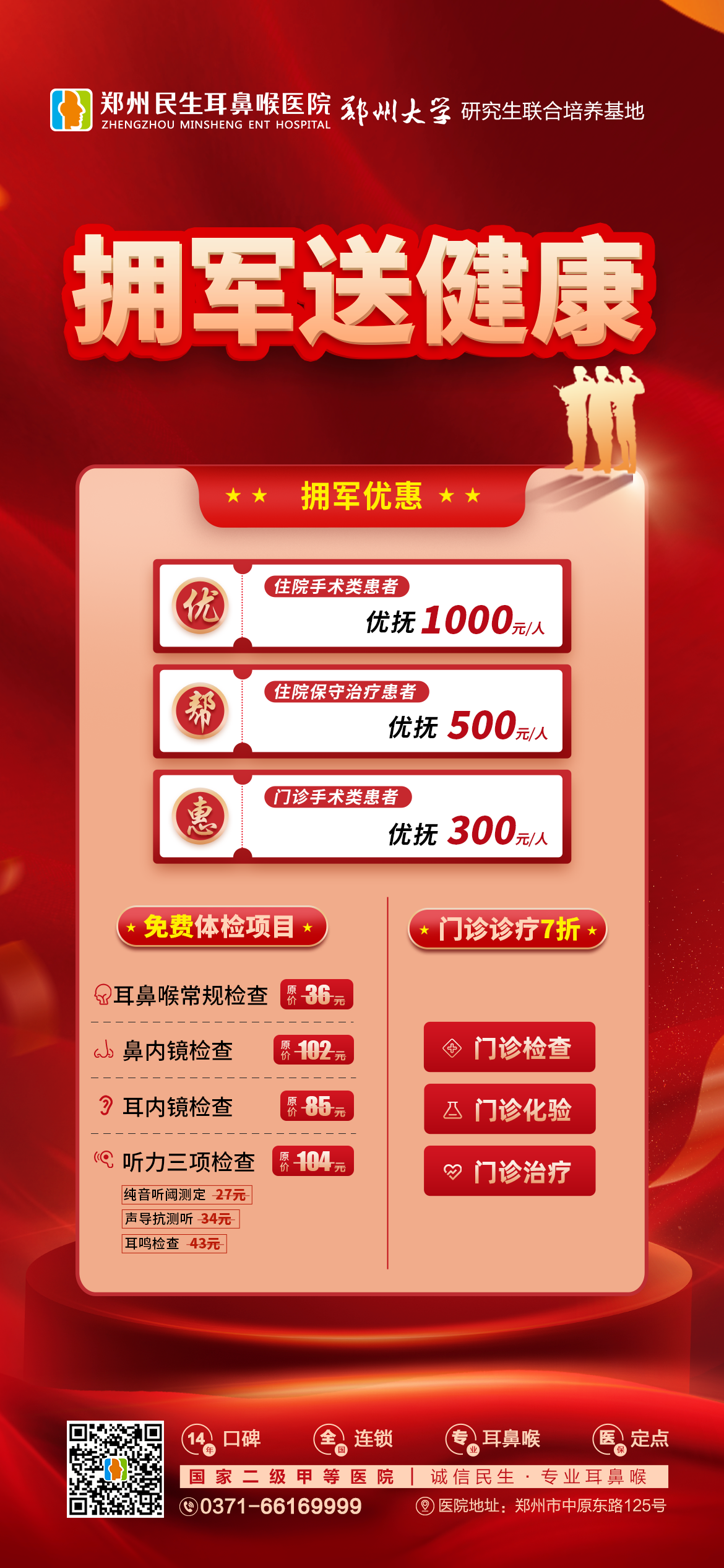 郑州民生耳鼻喉医院承诺发扬拥军优属、拥政爱民光荣传统,认真履行拥军优属社会责任,凡持有《中华人民共和国退役军人优待证》的退役军人、《中华人民共和国烈士、因公牺牲军人、病故军人遗属优待证》的其他优抚对象在本医院享受优先、优质、优惠的服务。