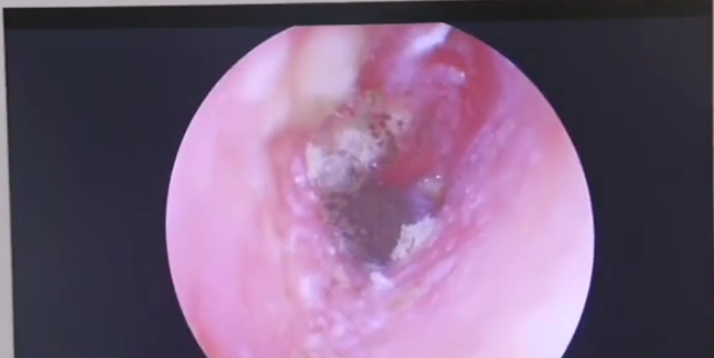随后郑州民生耳鼻喉医院张思叶主任经过耳内镜检查:外耳道及鼓膜可见白色粉末状的霉菌团(如下图)。