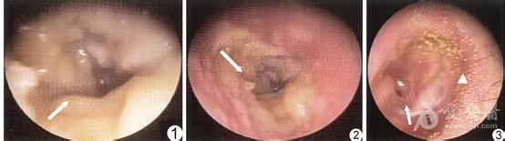 【临床表现】真菌性中耳炎的临床表现与慢性中耳炎急性发作极其相似,所以临床漏诊极高,尤期部分患者存在细菌混合感染,一半以上的患者发作初期误诊为普通细菌性中耳炎而应用抗生素滴耳,广谱抗生素的应用使得与真菌相拮抗的细菌簇受到抑制,致使真菌繁殖更加迅速。真菌性中耳炎除了耳痛、耳鸣、流脓液、耳闷胀或堵塞感等普通中耳炎症状外,外耳道深部常可见大量潮湿的灰白色糊状或膜片脱落上皮堆积、霉样痂皮或绒毛状污物附着、黄色或黑色颗粒状物贴附(见下图)